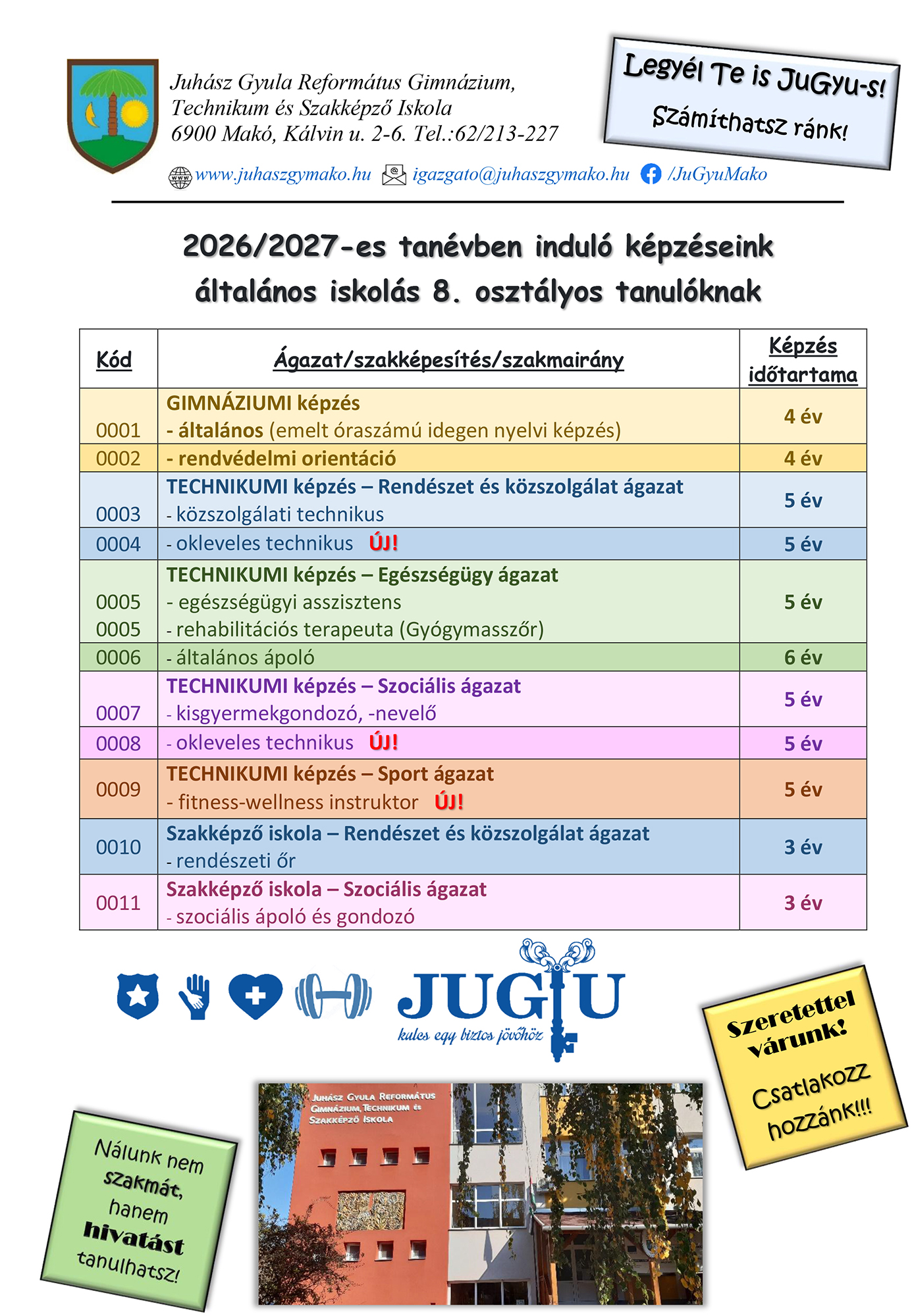 Az ország 446 technikumából a 100 legjobb között a JUGYU, Csongrád-Csanád vármegyei technikumok közül iskolánk a 8. helyen végzett!